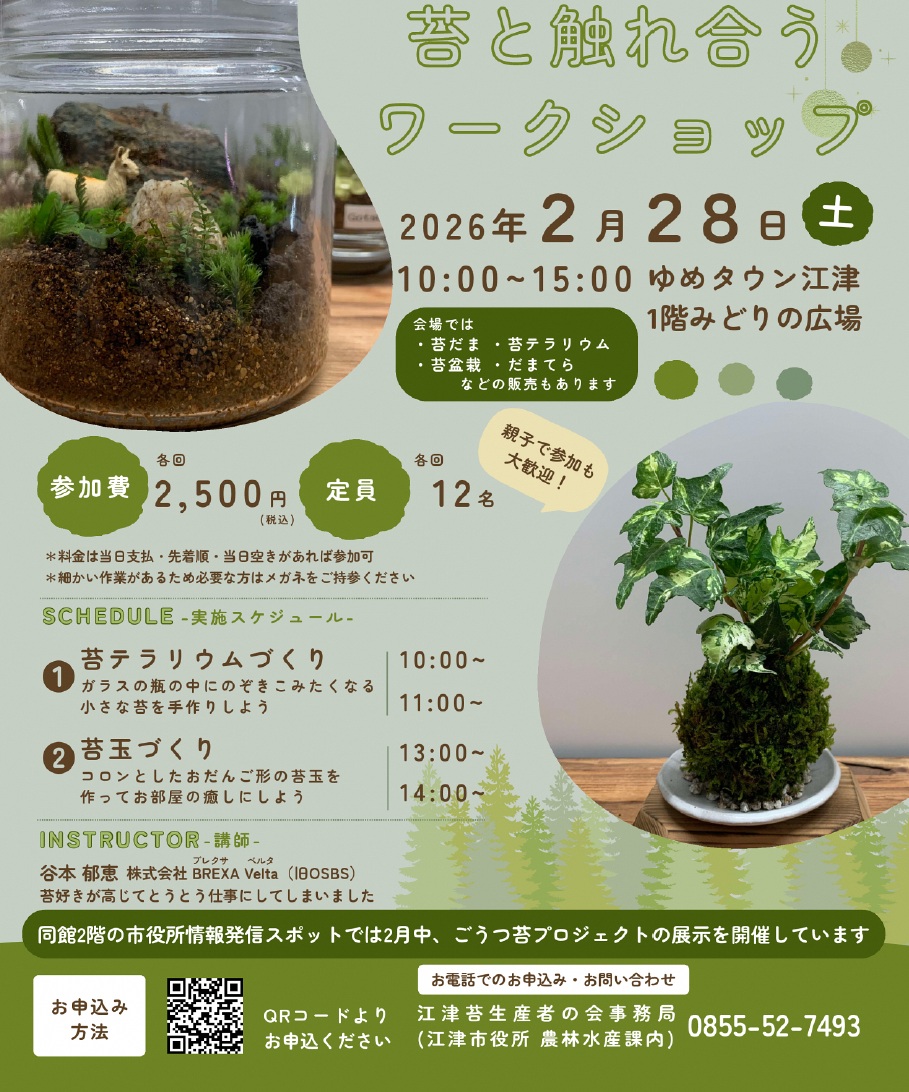 苔テラリウムづくりのワークショップ!苔の魅力や育て方を知りながら、自分だけの小さな森を作ってみませんか?市内の苔生産者と楽しく一緒に作りましょう。親子連れや初心者の方も大歓迎!※参加には、事前申込が必要です。