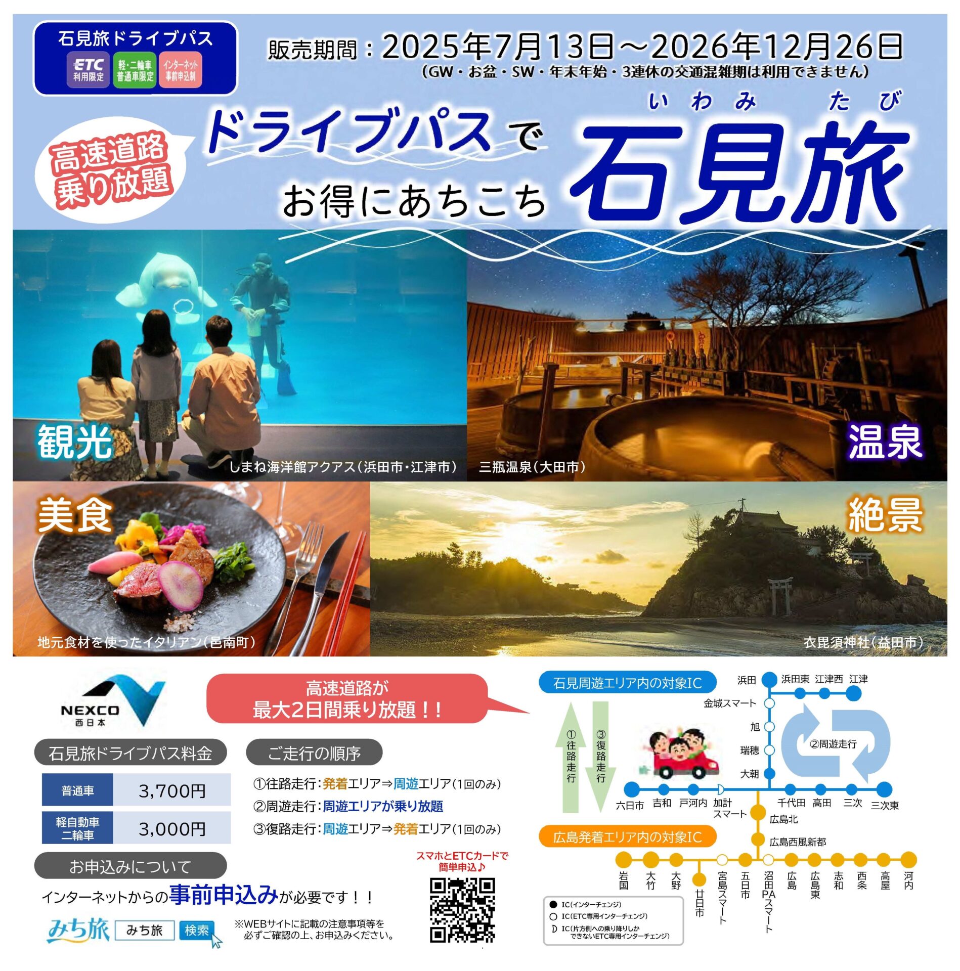 石見旅ドライブパスは、NEXCO西日本が販売する「広島発着エリアから石見周遊エリアへの往復走行」と「石見周遊エリア内の周遊走行(乗り放題)」がセットになった、最大2日間の高速道路料金の割引プランです!!