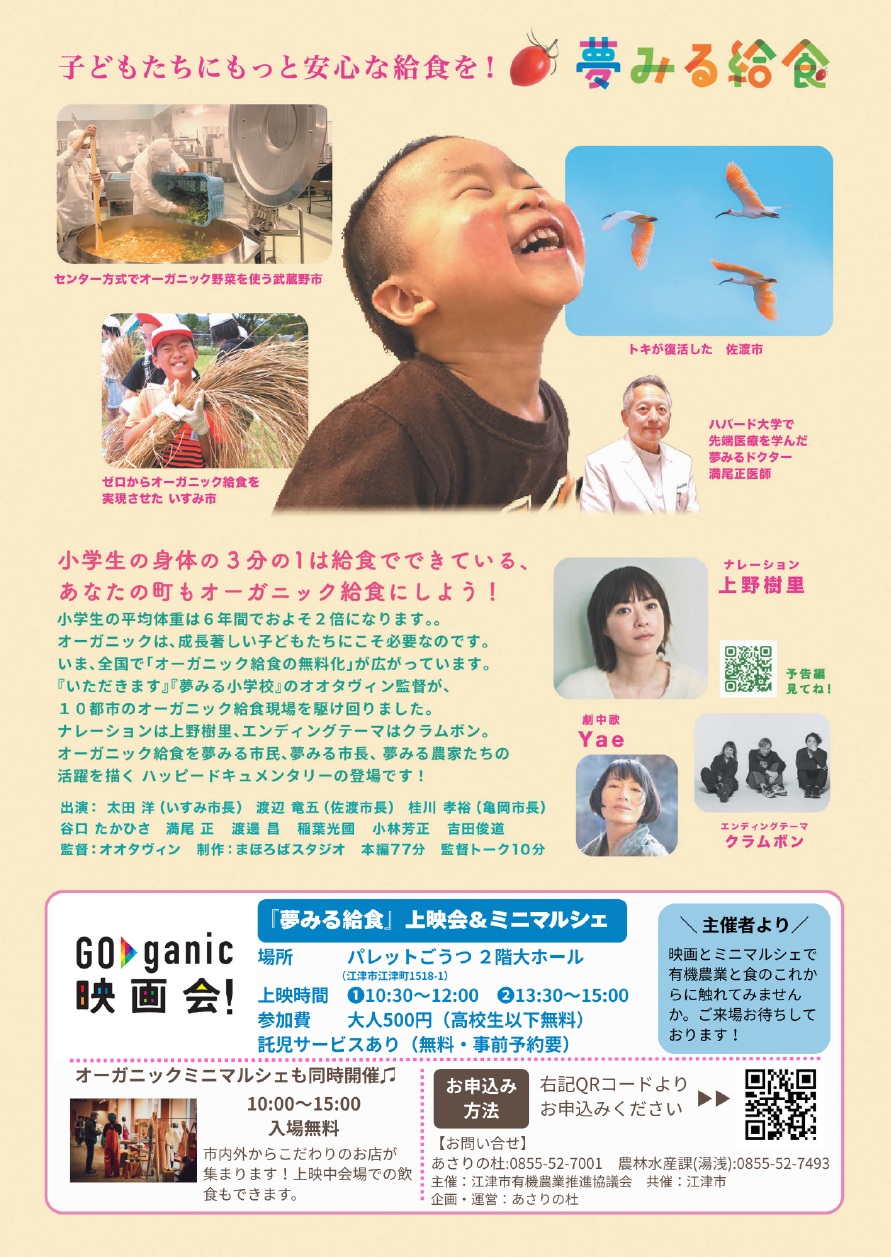 小学生の身体の3分の1は給食で出来ている!子供たちにもっと安心な給食を!と、オーガニック給食を実現させた市民たちが多数登場するハートフル・ドキュメンタリー映画。小学校の6年間で子どもたちの平均体重は約2倍になります。増えた体重は100%食べたもので作られています。成長期に食べる給食がどんな食べ物であってほしいか、子どもたちにどんな未来を残したいか、一緒に考えてみませんか?ぜひご家族やお友だちと観にきてください。