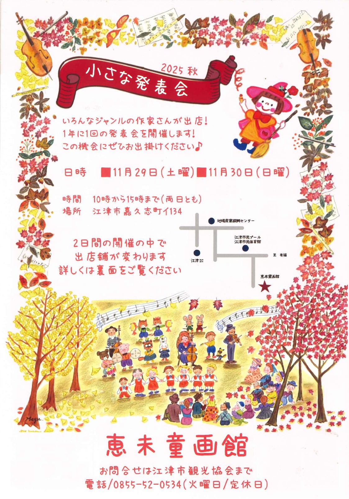 いろんなジャンルの作家さんが恵未童画館に出店!1年に1回の発表会を開催します。この機会にぜひお出かけください。 【日時】2025年11月29日(土)・30日(日)10時~15時【場所】恵未童画館(江津市嘉久志町イ134) Instagram / ホームページ MARCHE&WORK SHOP (出店者) マルシェ NAF竹田屋の欽ちゃん焼き(大判焼き10:00~販売 売切れ次第終了) ※11/29のみ出店 haru-はる-パン-洋菓子(パンの販売)※11/29のみ出店 キイロや(本日のお昼ごはん)※11/29のみ出店 お漬物の黒川さん(Qちゃん、茄子の辛子漬、らっきょう、11/29巻き寿司、11/30炊込みご飯) もぐもぐキッチン(米粉の蒸しパン他)※11/30のみ出店 パン工房 こむぎ(パン販売)※11/30のみ出店 Ryoko&Tom... -