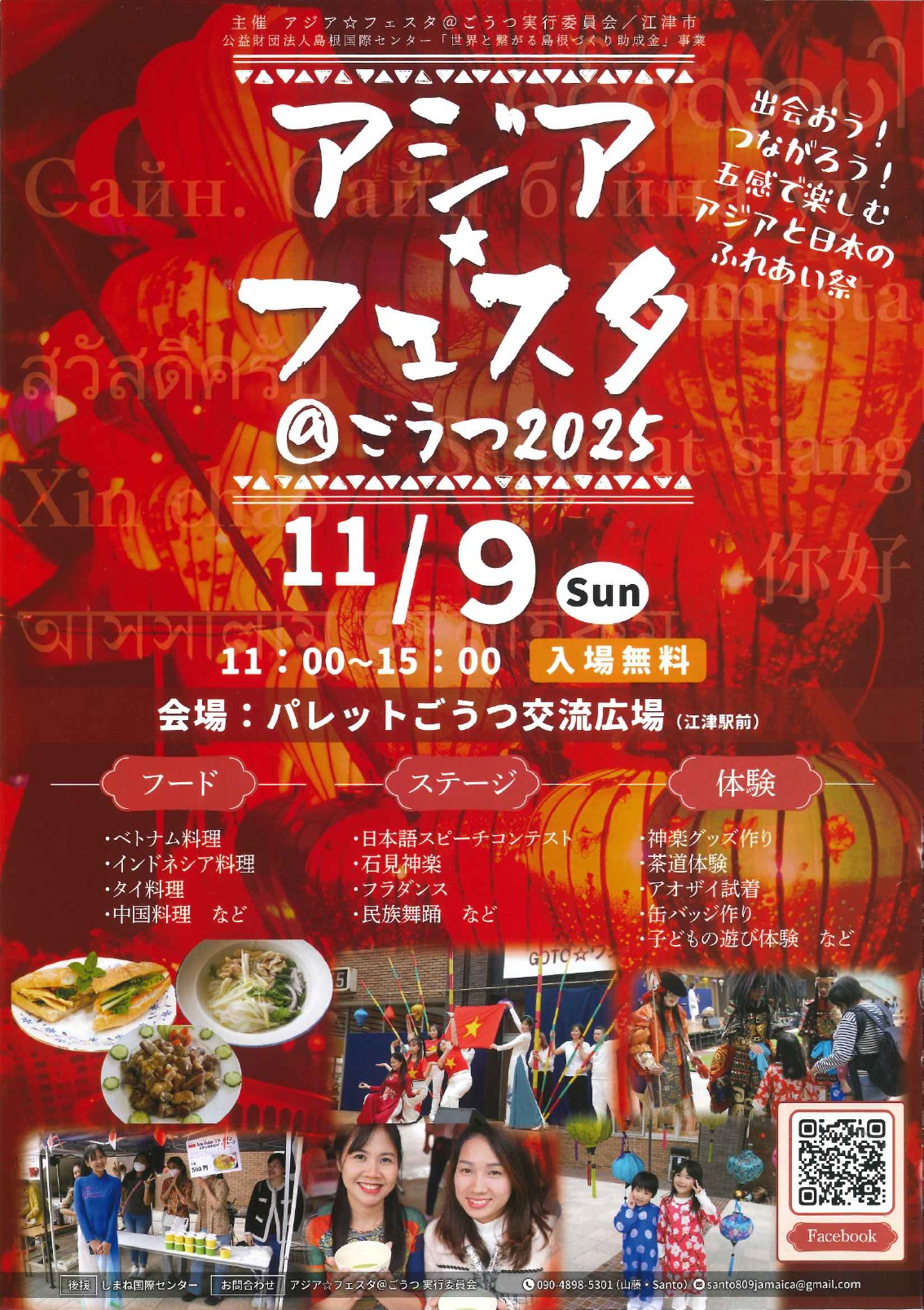 出会おう!つながろう!五感で楽しむアジアと日本のふれあい祭 【日時】2025年11月9日(日)11:00~15:00【会場】パレットごうつ交流広場(江津駅前)※入場無料【内容】 フード ベトナム料理 インドネシア料理 タイ料理 中国料理 など ステージ 日本語スピーチコンテスト 石見神楽 フラダンス 民族舞踊 など 体験 神楽グッズ作り 茶道体験 アオザイ試着 缶バッチ 子どもの遊び体験 など 【お問合せ】アジア☆フェスタ@ごうつ実行委員会 電話 090-4898-5301(山藤・Santo) メール santo809jamaica@gmai.com -